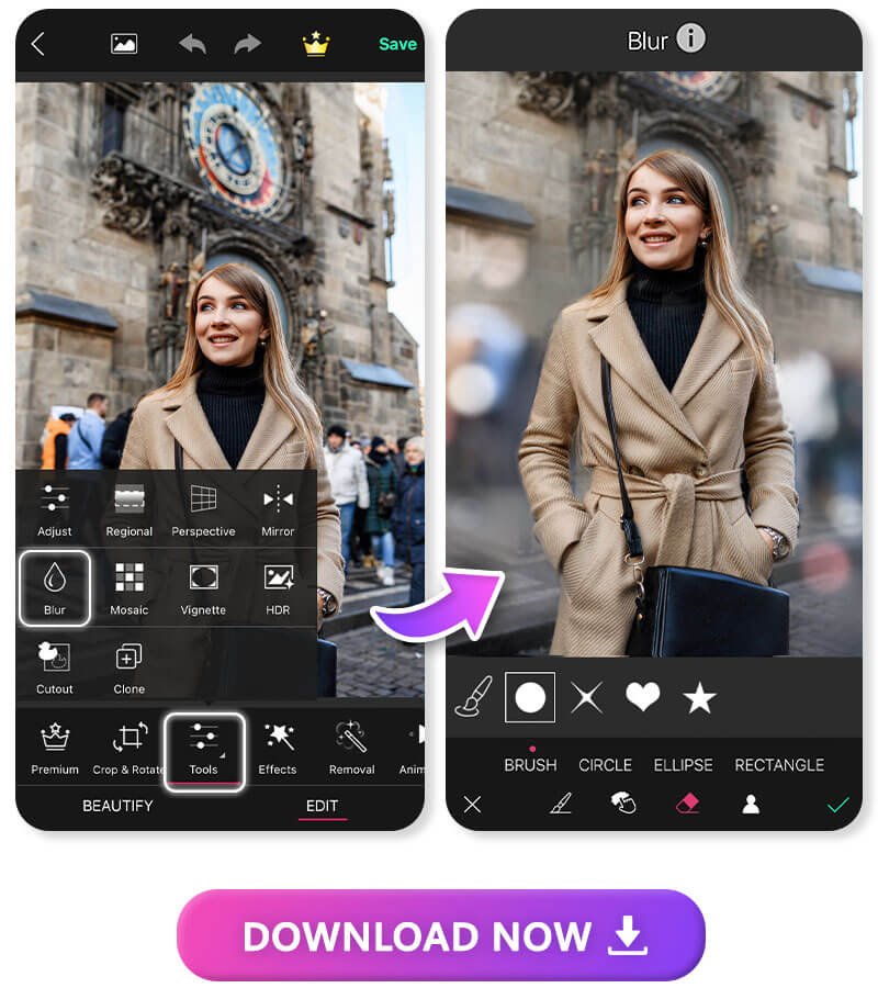With Blur Photo Editor, you can easily apply different types of blur effects to your portrait photos. You can choose from various blur styles, such as Gaussian blur, motion blur, and radial blur, to create the desired effect. The app also offers other editing tools like cropping, brightness adjustment, and filters.